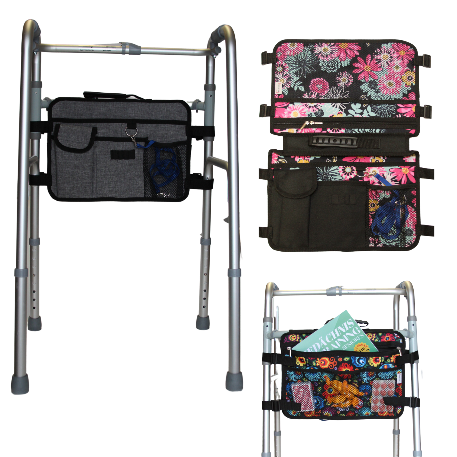 Mit insgesamt 9 Taschen vorne und hinten bietet die Gehhilfe Tasche schnellen und einfachen Zugriff auf alle Ihre häufig verwendeten Gegenstände wie Lesebrillen, Getränke, Snacks, Fernbedienung, Brieftasche, Bücher und medizinische Versorgung. Dank der vielen Taschen können Sie alles, was Sie benötigen, bequem verstauen und haben es immer griffbereit.